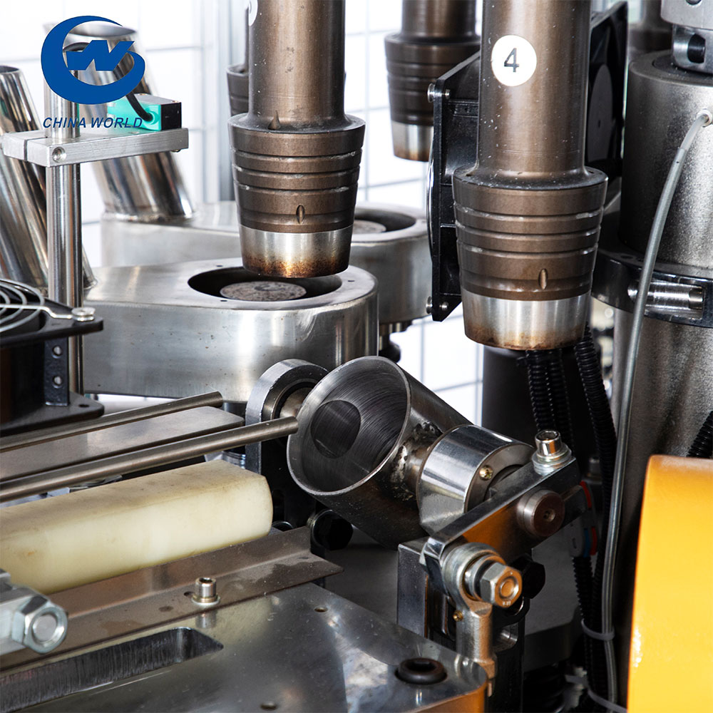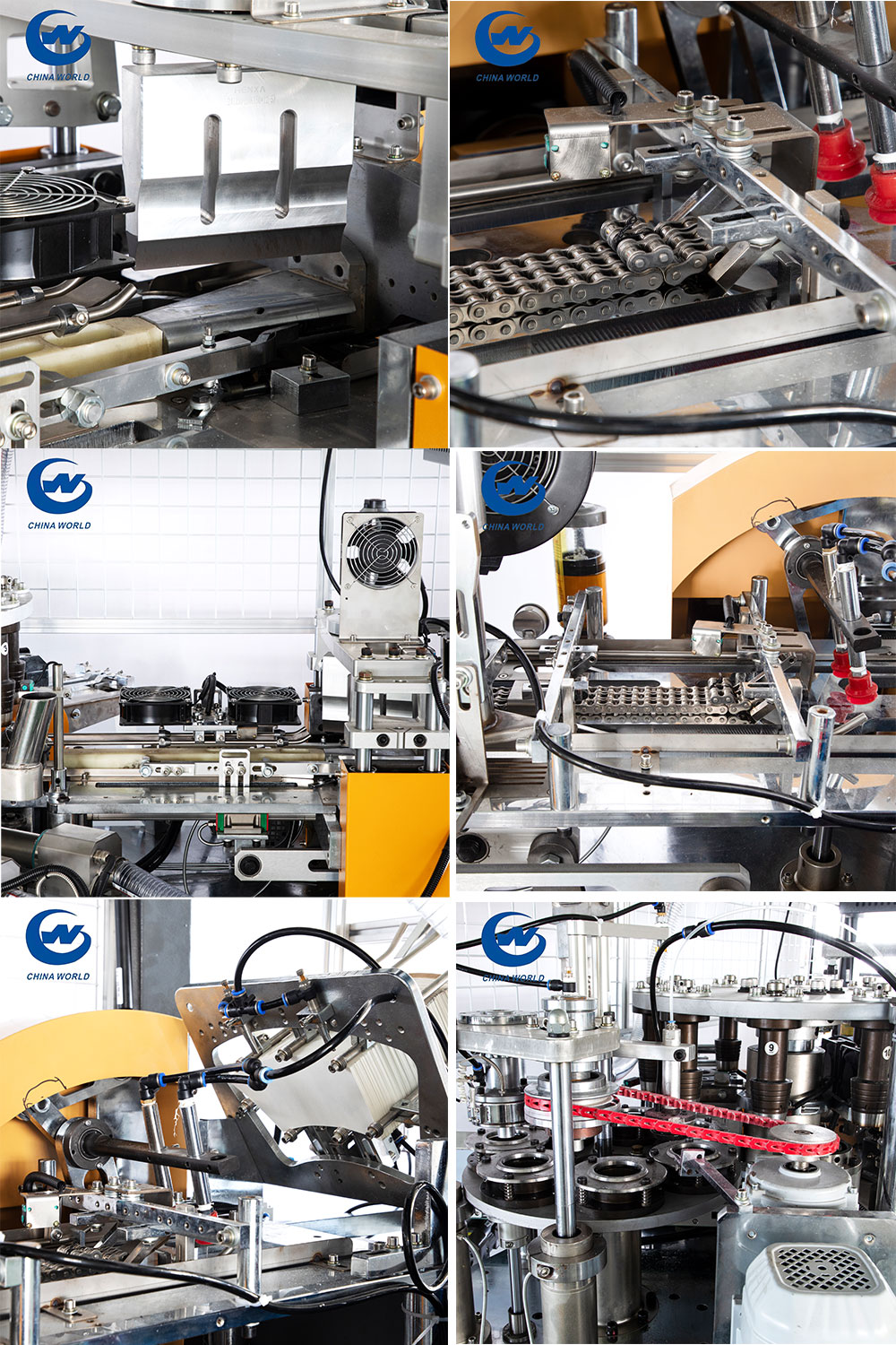 The CW-16 high-speed paper cup machine is a multi-station paper cup forming machine, which is currently the mainstream machine on the market. The roll mouth and rolling bottom adopt a dual disc separation process, and the roll mouth adopts two processes to form, making the cup mouth more round. Especially for thick paper, a single disc machine cannot achieve a smooth and even roll mouth. This model does not have this problem. The whole machine adopts frequency conversion speed regulation, automatic oil injection, servo bottom feeding, ultrasonic welding, and high production speed, Up to 150 per minute, this machine belongs to the mid to high end model.